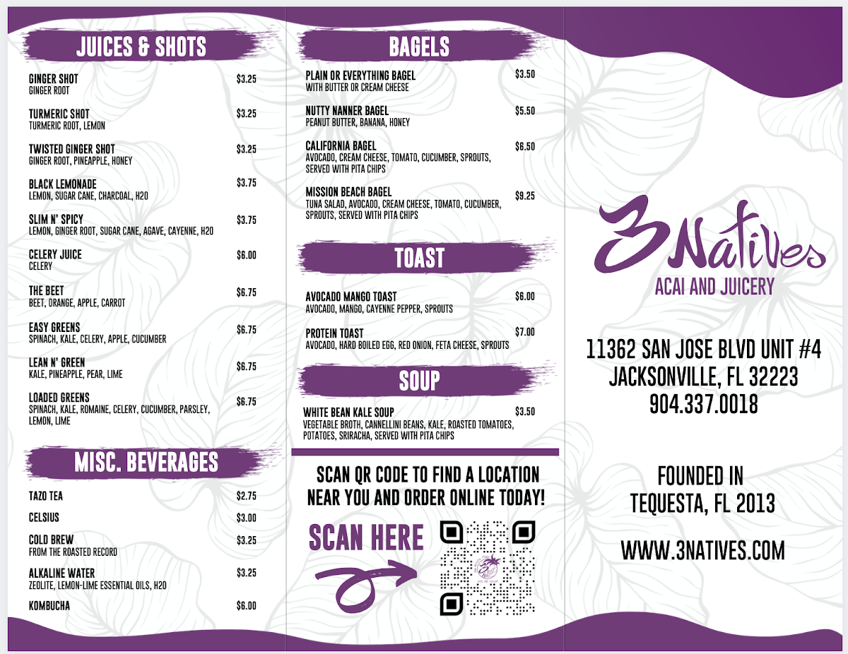 Welcome to 3Natives - Jacksonville, a vibrant eatery located at 11362 San Jose Blvd. Here, the menu is a delightful exploration of bold flavors and fresh ingredients. The standout item, the Tajin Mango Bowl, features a luscious mango base topped with granola, kiwi, and a sprinkle of Tajin, tantalizing your taste buds for just $9.25.